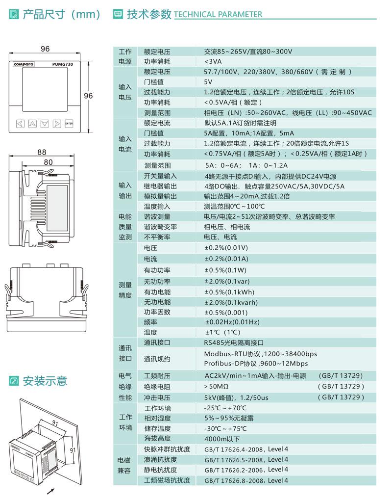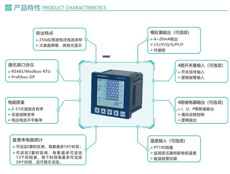 PUMG730系列多功能儀表具有精確的電力參數(shù)測量,雙向四象限電能計量、統(tǒng)計、記錄等功能。采用先進的ARM處理器和數(shù)字信號處理技術(shù)設(shè)計而成。集合全面的三相電量測量/顯示、電能、累計、電能質(zhì)量分析、復(fù)費率統(tǒng)計、數(shù)字輸入/輸出與通訊網(wǎng)絡(luò)于一體。具有精細的制造工藝,良好的電氣絕緣和電磁兼容性,大屏幕LCD液晶顯示等優(yōu)點。