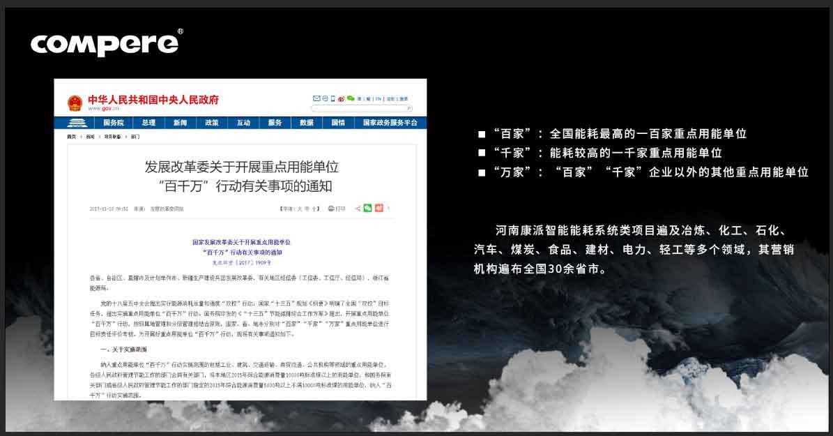 T@Energy-Online能耗在線監(jiān)測系統(tǒng),是康派智能自主研發(fā)的能耗監(jiān)測系統(tǒng),積極響應(yīng)了國家發(fā)展改革委關(guān)于能耗在線監(jiān)測系統(tǒng)推廣建設(shè)通知,在協(xié)助重點用能單位信息化轉(zhuǎn)型、促進節(jié)能增效并提升市場競爭力的同時,完成系統(tǒng)建設(shè)任務(wù)與數(shù)據(jù)上傳要求,通過政府驗收。
