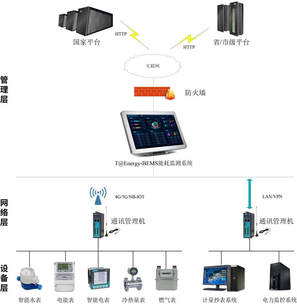 設(shè)備層:主要由電能表、水表、燃?xì)獗怼⒗錈崃?、蒸汽表以及第三方監(jiān)測系統(tǒng)組成。