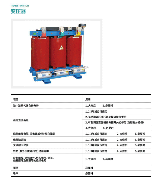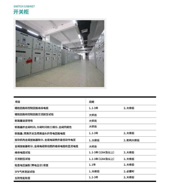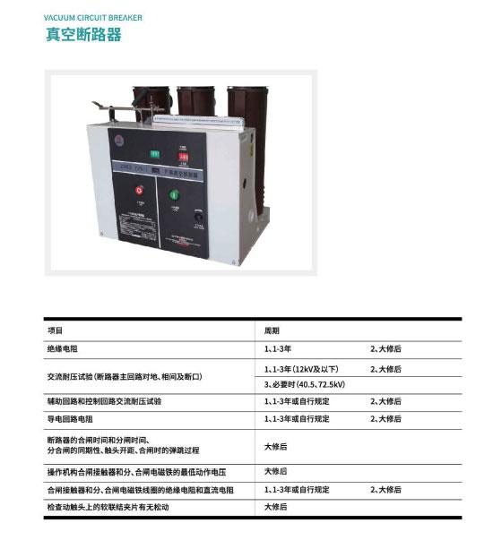 根據(jù)DL/T 596-2005《電力設(shè)備預(yù)防性試驗(yàn)規(guī)程》要求,電氣設(shè)備需按照規(guī)范要求定期做預(yù)防性試驗(yàn)及完成相應(yīng)試驗(yàn)項(xiàng)目,其中變壓器、電力電纜、真空斷路器和開關(guān)柜等主要的配電室內(nèi)電氣設(shè)備的常規(guī)試驗(yàn)項(xiàng)及周期如下所示。