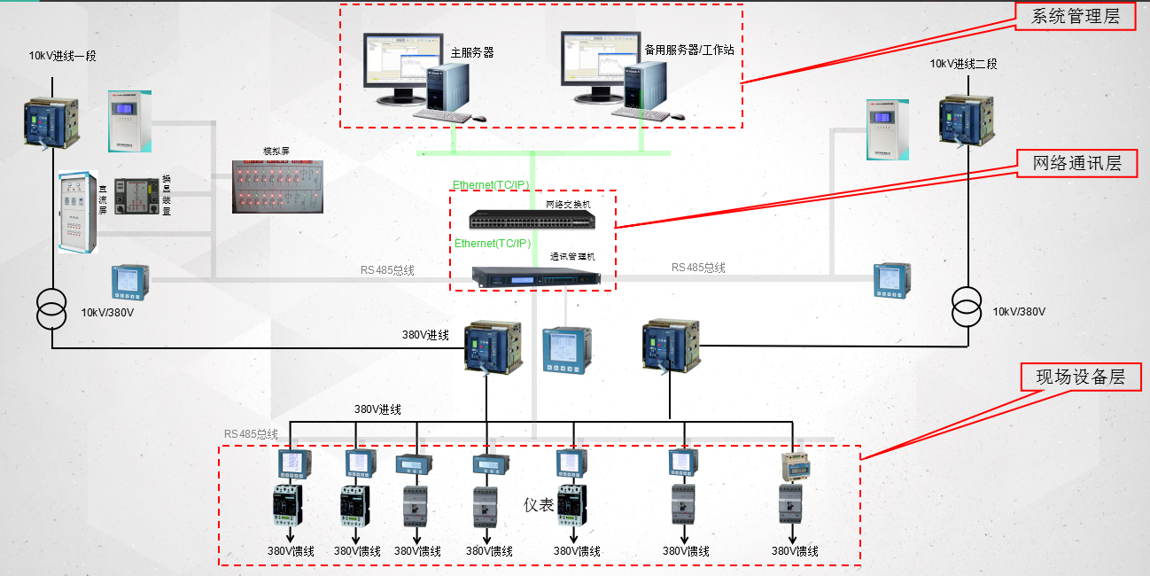 污水處理廠電能管理系統(tǒng)項(xiàng)目案例通過(guò)采用康派智能的電力儀表及電能管理系統(tǒng),對(duì)中低壓系統(tǒng)的設(shè)備進(jìn)行實(shí)時(shí)監(jiān)控及數(shù)據(jù)采集。數(shù)據(jù)采集主要包括模擬量以及開(kāi)關(guān)量的采集。模擬量的采集主要是對(duì)線路電壓、電流、功率、功率因數(shù)、頻率等信息進(jìn)行采集,開(kāi)關(guān)量的采集則主要是對(duì)斷路器的工作狀態(tài),以及斷電保護(hù)、運(yùn)行故障等報(bào)警信息進(jìn)行采集,實(shí)現(xiàn)遠(yuǎn)程數(shù)據(jù)的本地實(shí)時(shí)顯示。