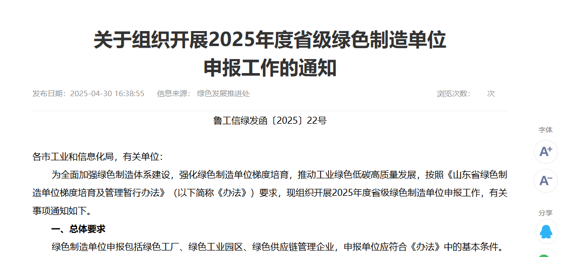 為全面加強(qiáng)綠色制造體系建設(shè),強(qiáng)化綠色制造單位梯度培育,推動工業(yè)綠色低碳高質(zhì)量發(fā)展,按照《山東省綠色制造單位梯度培育及管理暫行辦法》(以下簡稱《辦法》)要求,現(xiàn)組織開展2025年度山東省綠色工廠、綠色工業(yè)園區(qū)申報(bào)工作。