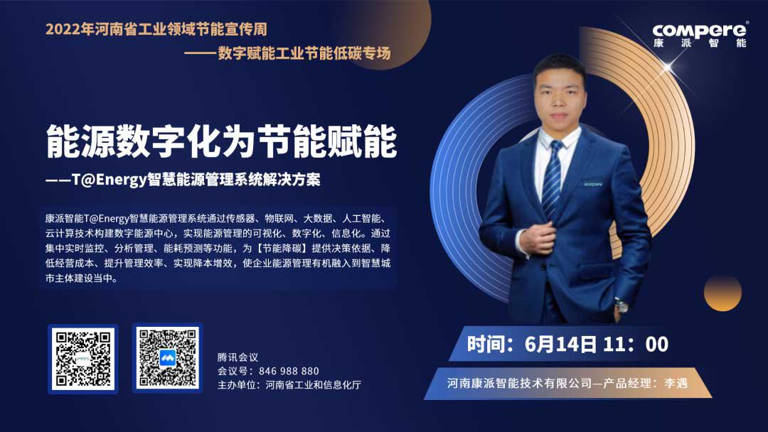 2022年6月,響應(yīng)國(guó)家發(fā)改委與河南省工信廳“節(jié)能宣傳周”活動(dòng)要求,康派智能積極響應(yīng),主動(dòng)配合完成數(shù)字賦能工業(yè)節(jié)能低碳專場(chǎng)活動(dòng),以線上宣傳的方式,向社會(huì)及工業(yè)企業(yè)完成主題為《能源數(shù)字化為節(jié)能賦能--T@Energy智慧能源管理系統(tǒng)解決方案》的宣講活動(dòng)。
